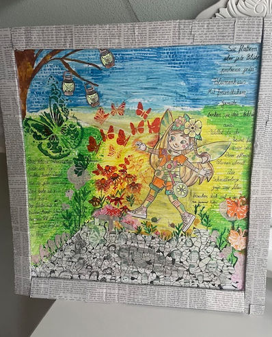 Die Fee habe ich auf ein festen Untergrund einer Pappe und mit Schablonenarbeit und viele Mixed Media Techniken beareitet.